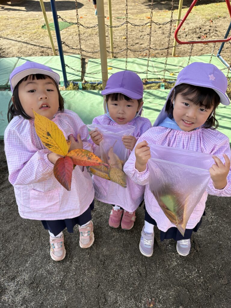 最近の朝の外遊びでは、園庭の葉っぱも紅葉が進んでいることに気付き