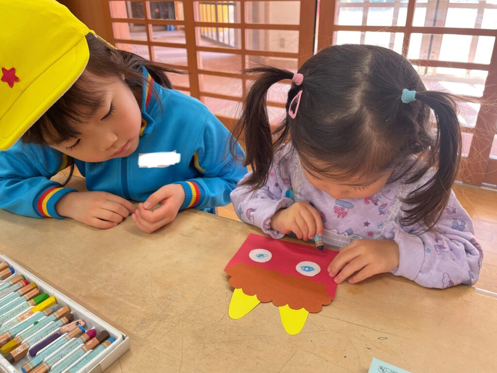 鬼の目をつけて、クレヨンで色塗り🖍️