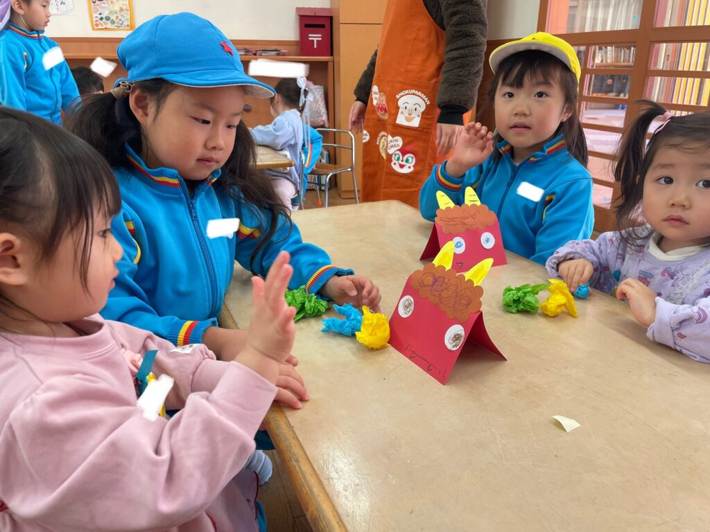 出来上がった鬼に、花紙で作った豆🫘投げて鬼退治💥