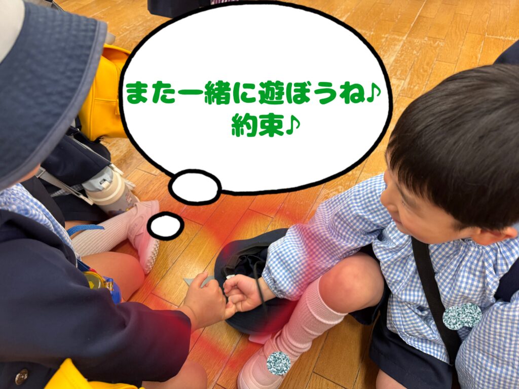 降園が近づいてきた頃には、「また遊ぼうね!約束だよ!!」と約束を誓い合う可愛らしい姿がみられました💓
