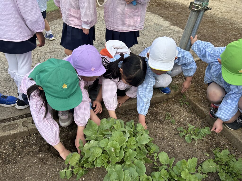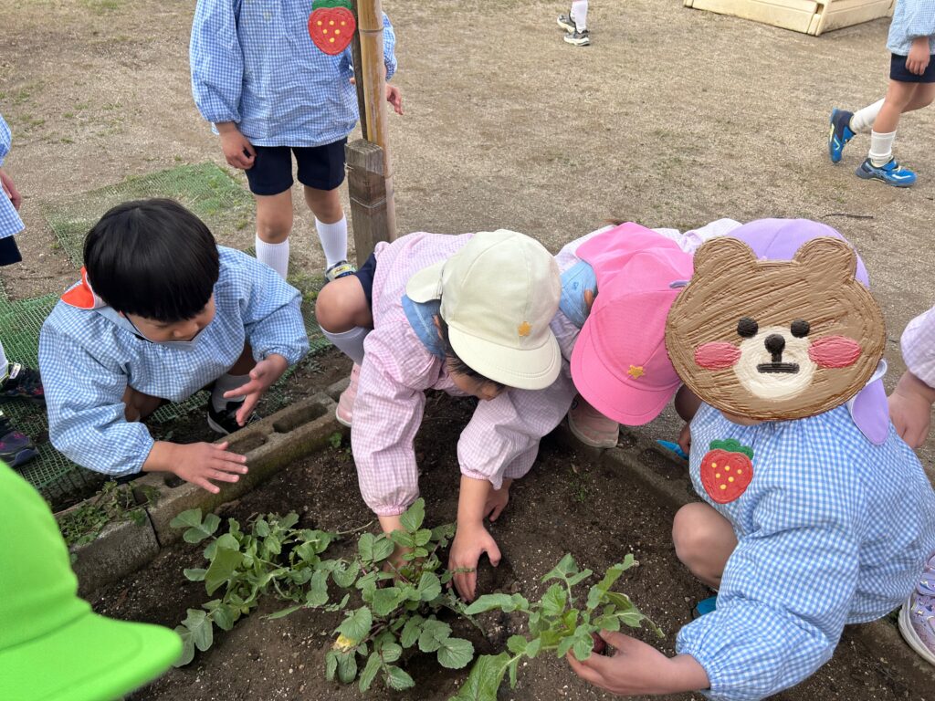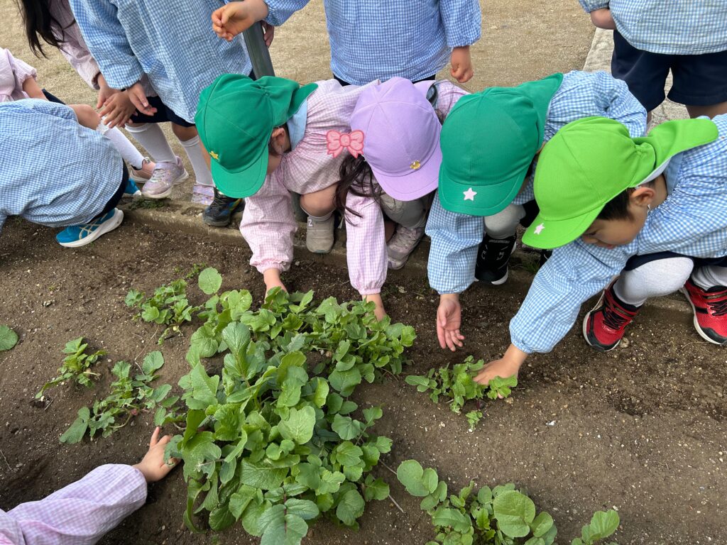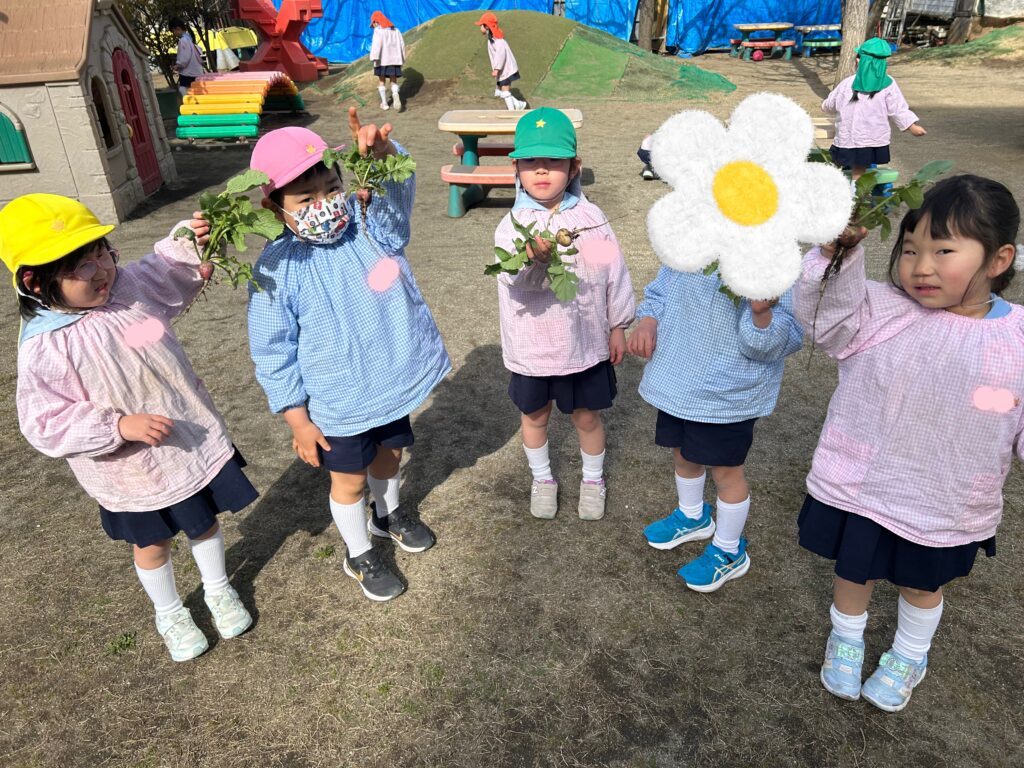 本日は、子ども達と一緒にちびっこ広場で育てた野菜【ラディッシュ】が、大きく成長した為、みんなで収穫をしていきました✨