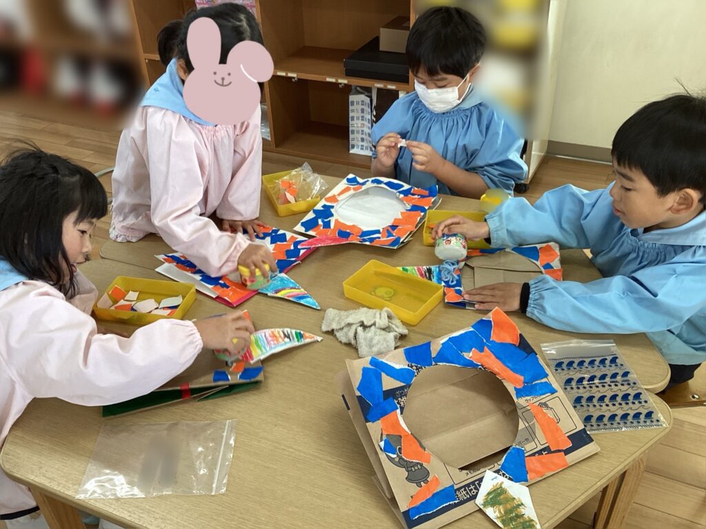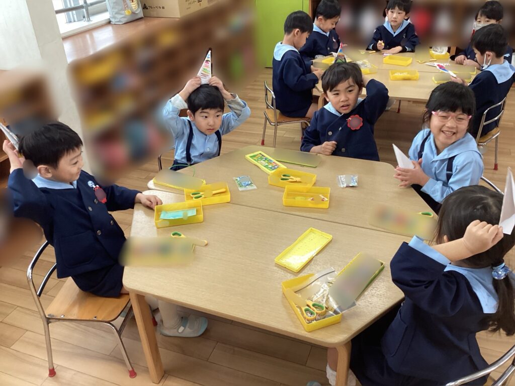 どうやってやるの?と苦戦していましたが友達同士で教え合い、切り終えると早速被ってみる子も!!
