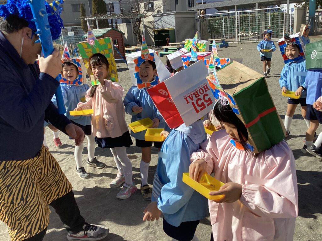 どんぐり山や砂場などを探していると鬼が現れ、良い反応をしてくれる子ども達に、赤鬼としてやり甲斐を感じました(笑)