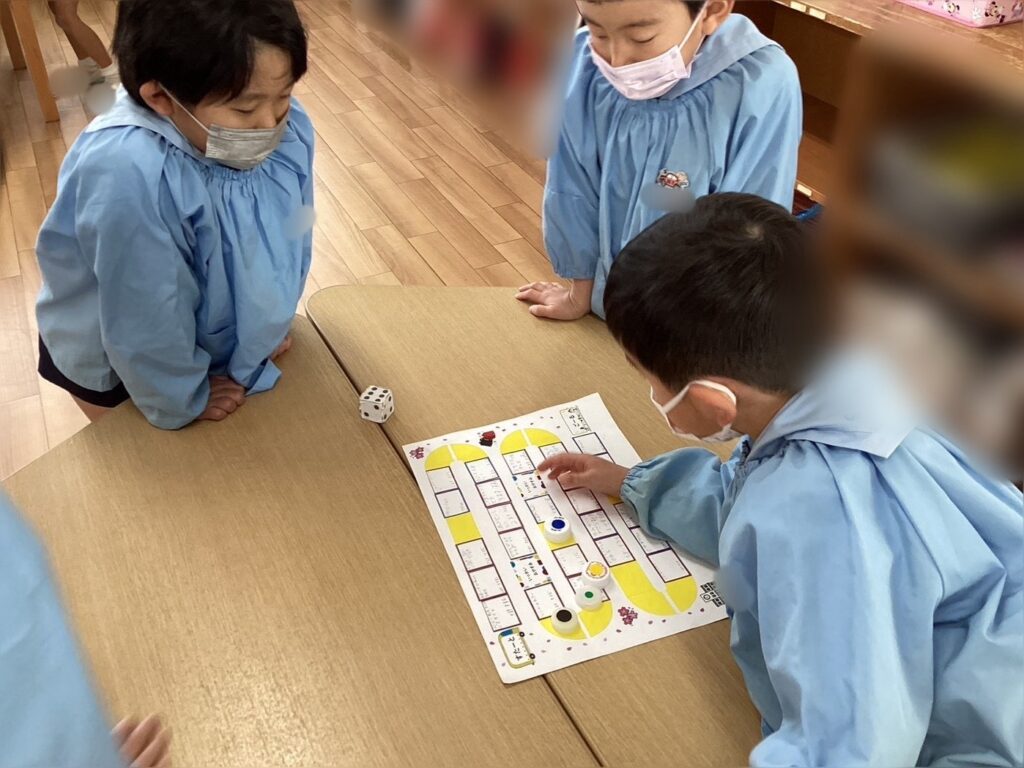 2組さんのすごろくにはなかった内容のマスもあり、「ママと結婚するだって〜!」「逆上がりが出来たもあるよ!」と1マスずつ内容を楽しみながらサイコロを降って、遊んでいます♪