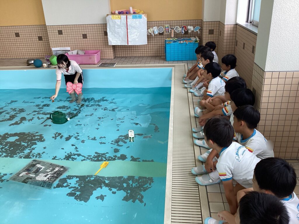 プールで、水に浮く物・沈む物の実験を行いました。