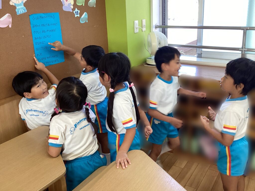 集団体操の最後「はぎわらのこころ」をすみれ組全員で言うのですが、時間を見つけてはこの場所に集まり言葉を覚えています!