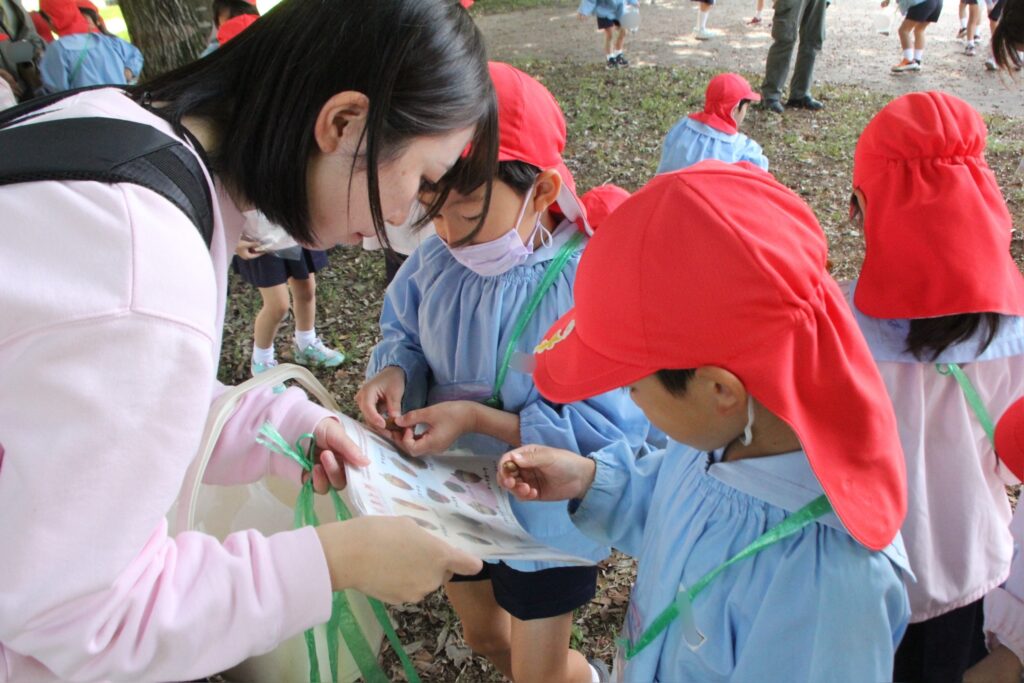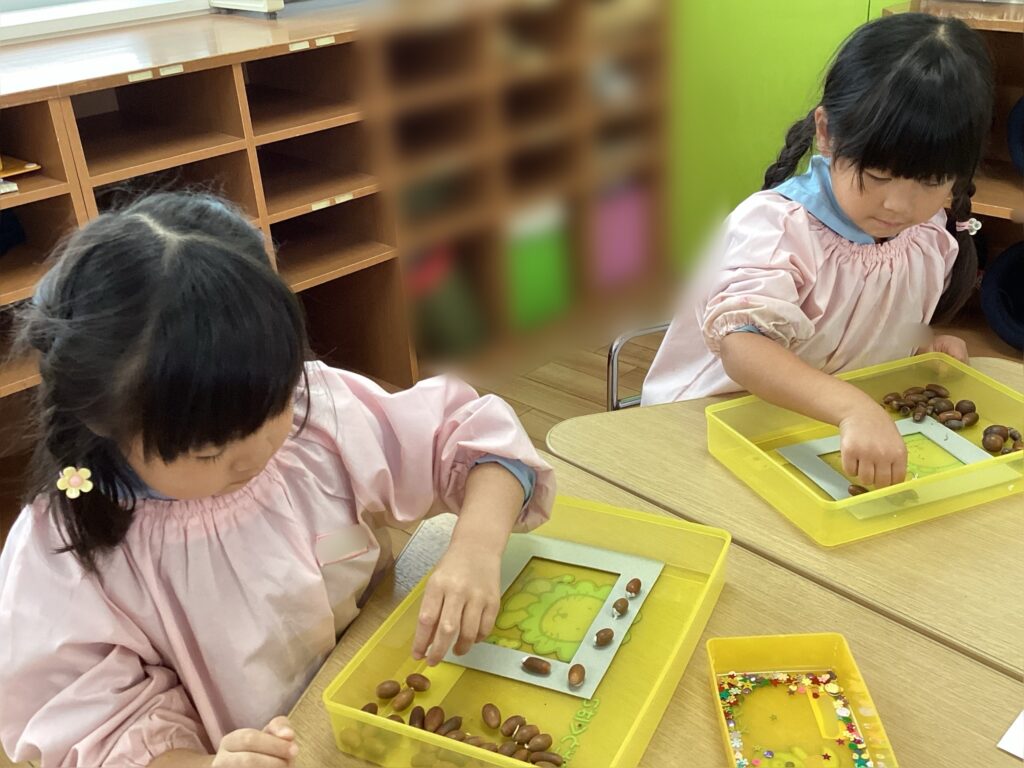 ただ拾うだけでなく、どんぐりの特徴が書かれた用紙を見ながら種類を確認したり、製作で使用する為のどんぐりを選んでいました。