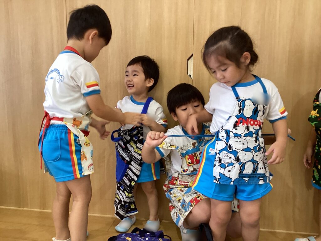 まずは、エプロンのお手伝い。