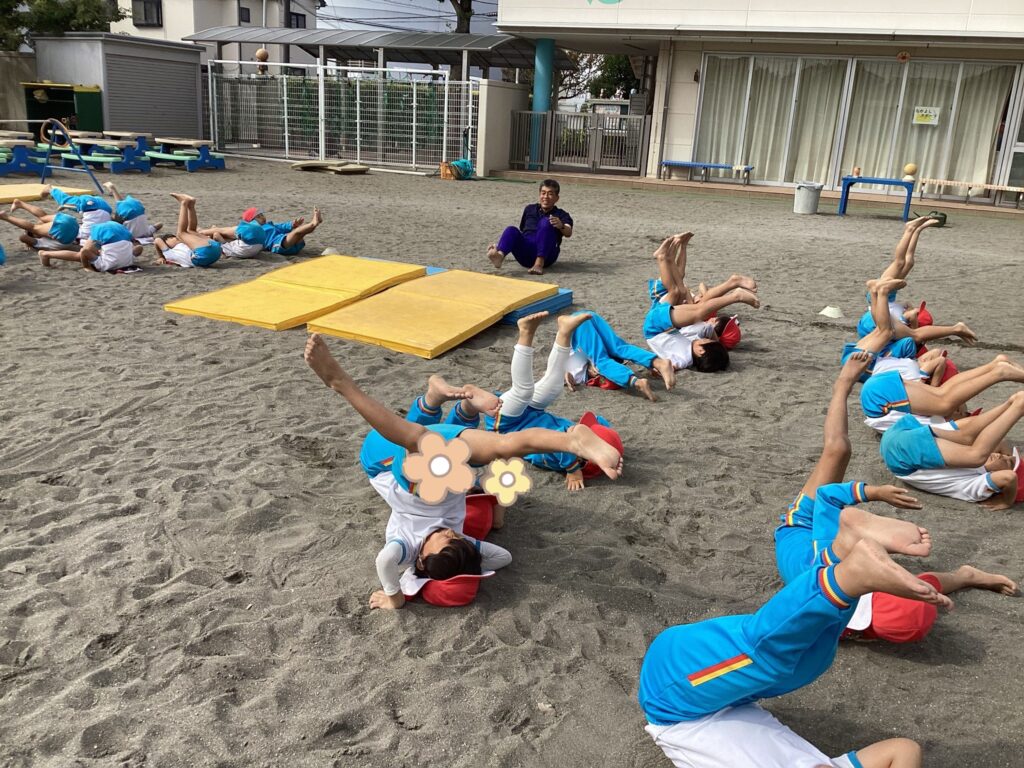 「えび〜!」という掛け声で後ろに倒れていくのですが、意外と難しくなかなか手がつかないお友達も。
