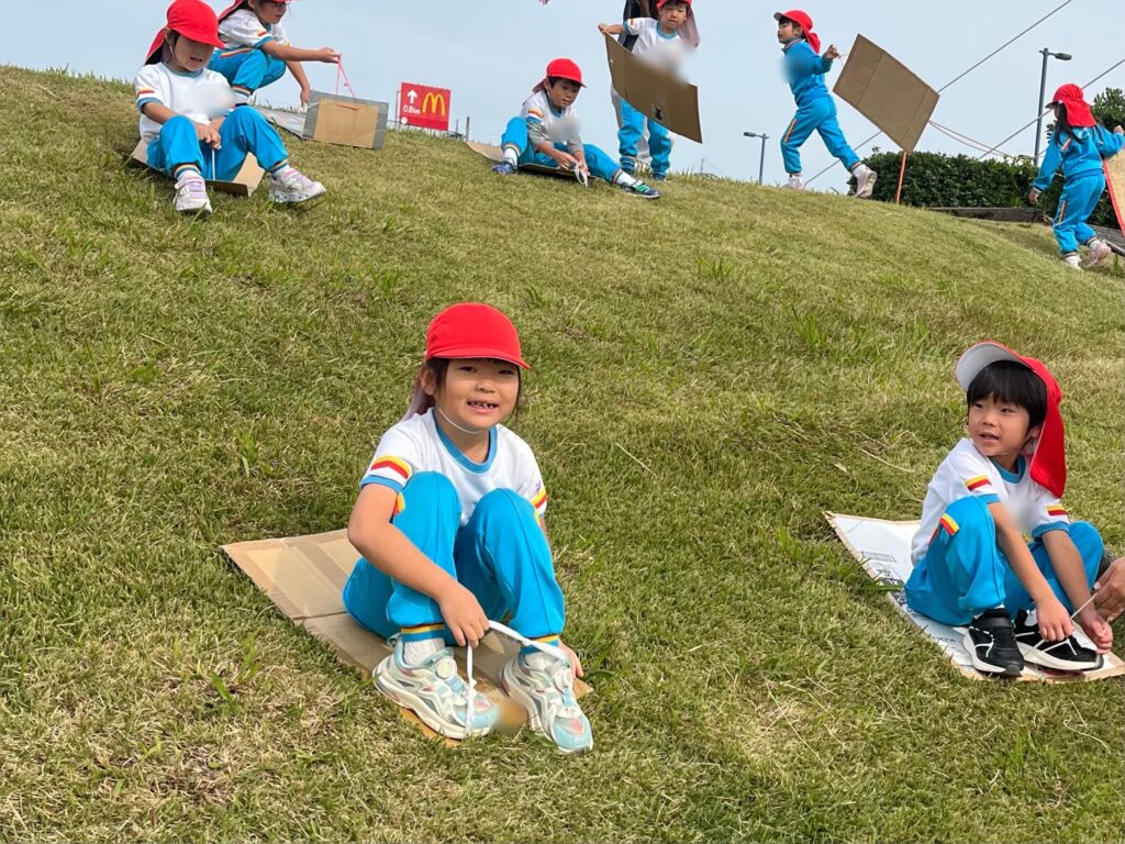 今日は元荒川の土手へ芝滑りに行きました!