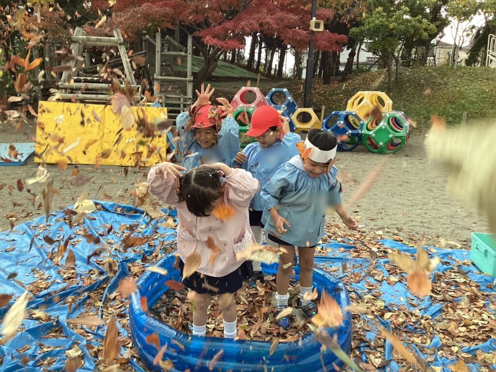 また、落ち葉のプールコーナーでは両手いっぱいに持った落ち葉を投げシャワーのようにして遊んでいました♪