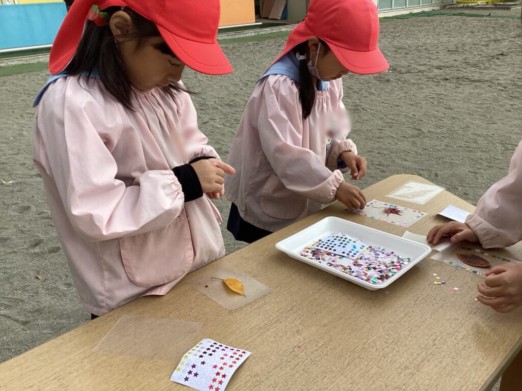 ラミネートフィルムに落ち葉やスパンコールをはさみ、アイロンをかけて素敵なカードを作りました!