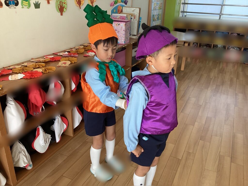 発表会衣装に着替える時、野菜のベストは後ろにマジックテープがある為、一人で着るのは難しい…。