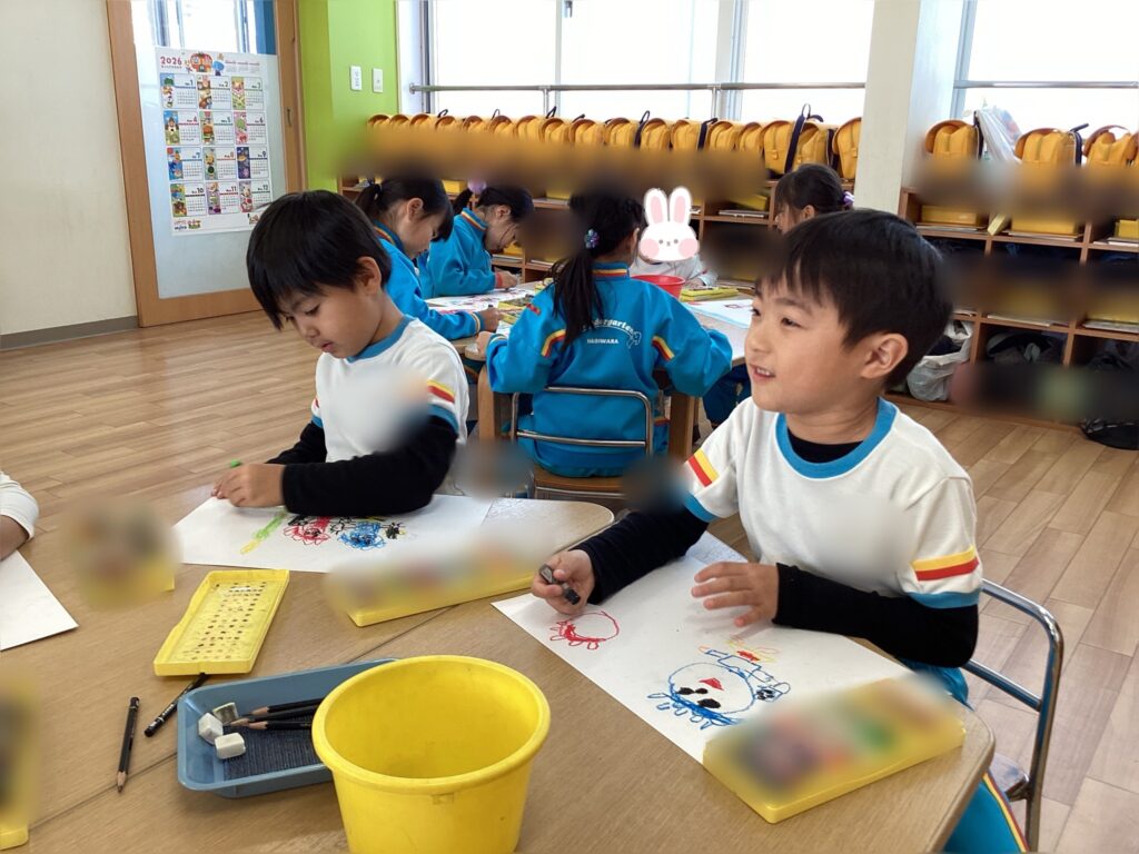前日に行った豆まきの絵を描きました。