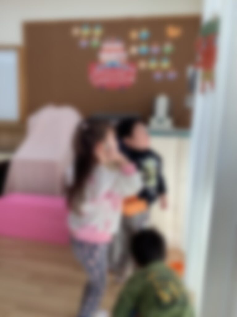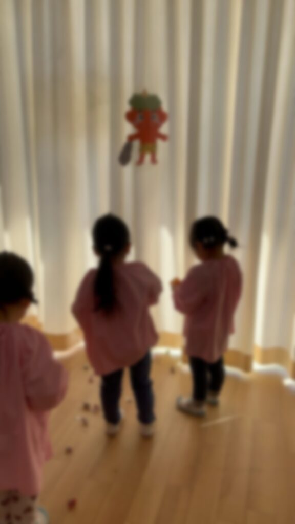 お部屋にいる鬼に一生懸命豆を投げてくれました。