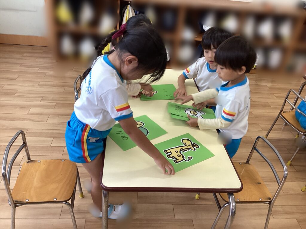 グループ毎にしりとりに挑戦していくと、『スタート』の合図で一斉にカードを並べ替え「こっちだー」と協力しながらしりとりを完成させる事が出来ました。