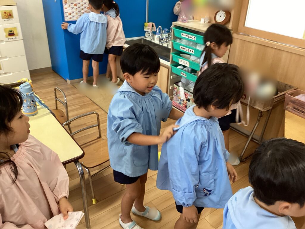 子ども同士で襟が出ているか確認して「出てないよー出してあげる」と声を掛け合う姿が見られています。