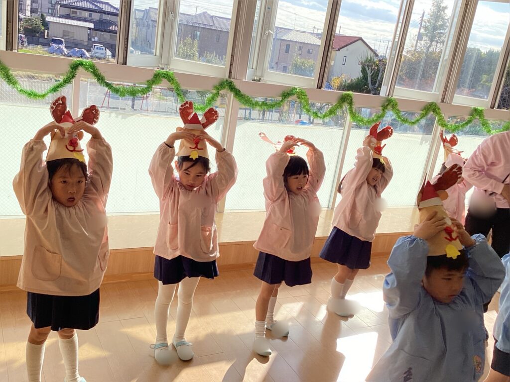 まずは製作した帽子をかぶってみんなノリノリ♪可愛い振り付けをつけながら元気に歌う事ができました!