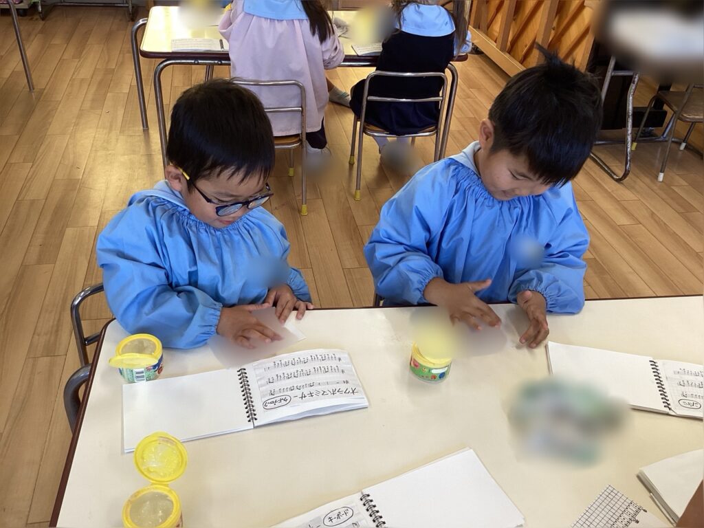 周り糊はもう完璧!楽譜を貼り終わると「この星のところで音を鳴らすのかな」と楽譜を読み始めている子もいました!