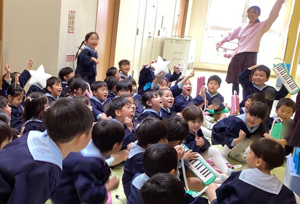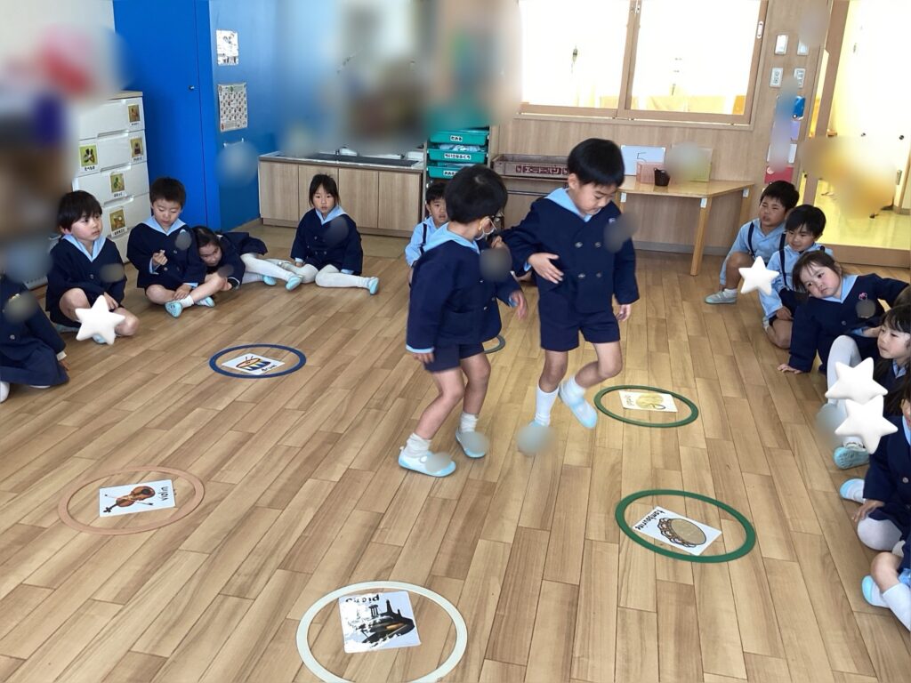 最近は楽器の名前を覚えるゲームを行っています。先生が発音した楽器と同じ写真を探すゲームが大盛り上がり!音楽会の時期という事もあり、身近な楽器の名前は完璧に覚え、とても楽しい時間になりました。