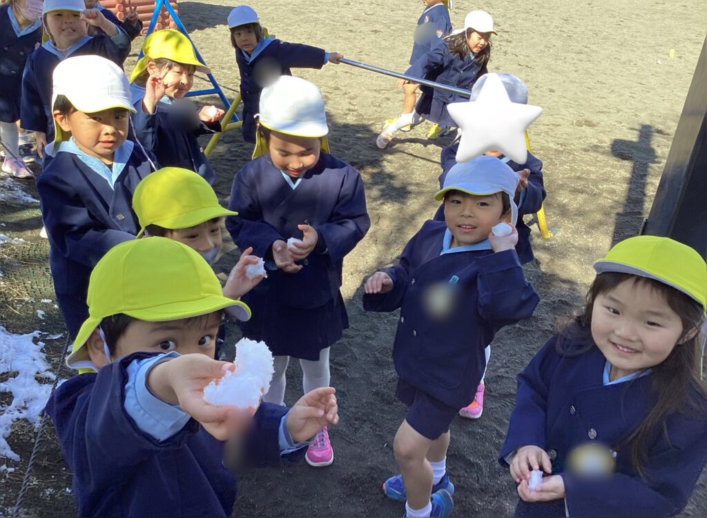 幼稚園でなかなか出来ない遊びに大喜びの子どもたち。冷たい雪をそーっと触ったり、丸めて雪合戦をしたりと楽しく遊びました。