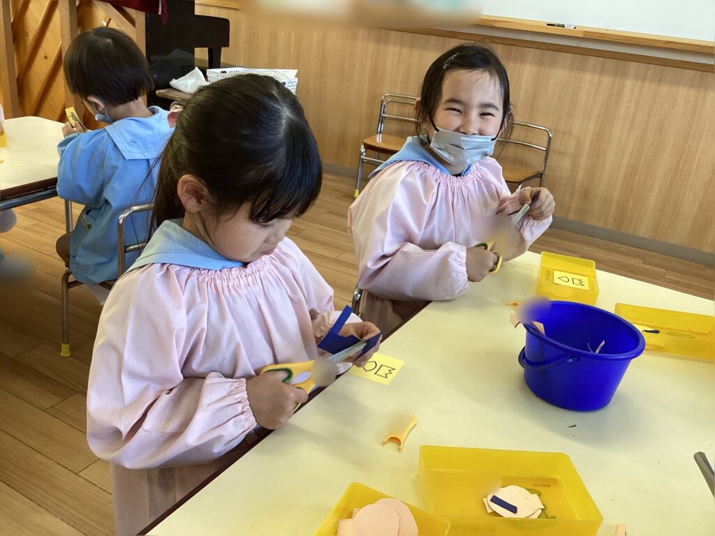 ひな祭りの製作はばら組の集大成ともなる作品です。見本を見せると「可愛い〜でも難しそう」と声も上がりましたが、細かい扇や尺等の細かいパーツを切っていくと、「上手に切れた!」と自慢げな様子。