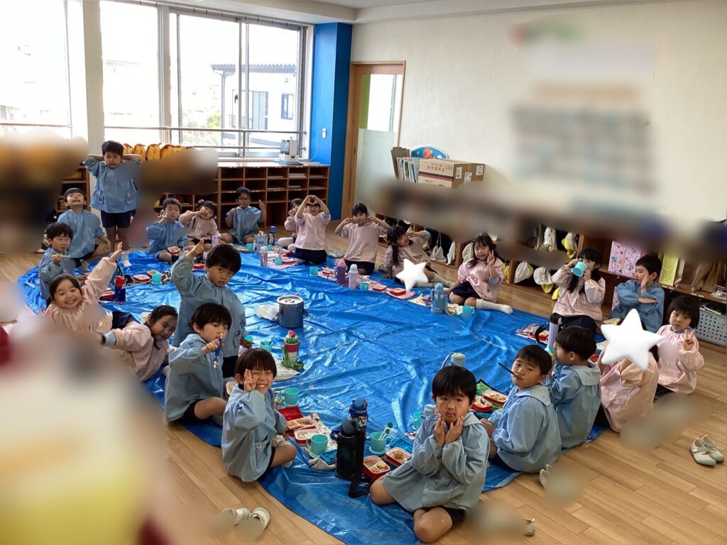 その後、久しぶりにブルーシートを敷いて給食を食べました。すると一人のお友達から「みんなで頑張ったから今日のご飯は美味しいね」と素敵な言葉が!!!