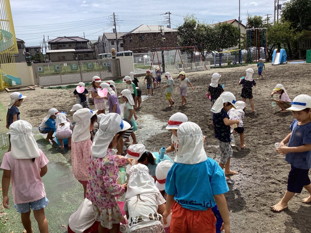 振り返ると初めは水に苦手意識があったお友達も少しずつ水に慣れ、お友達や先生と水を掛け合う姿が沢山見られるようになりました。