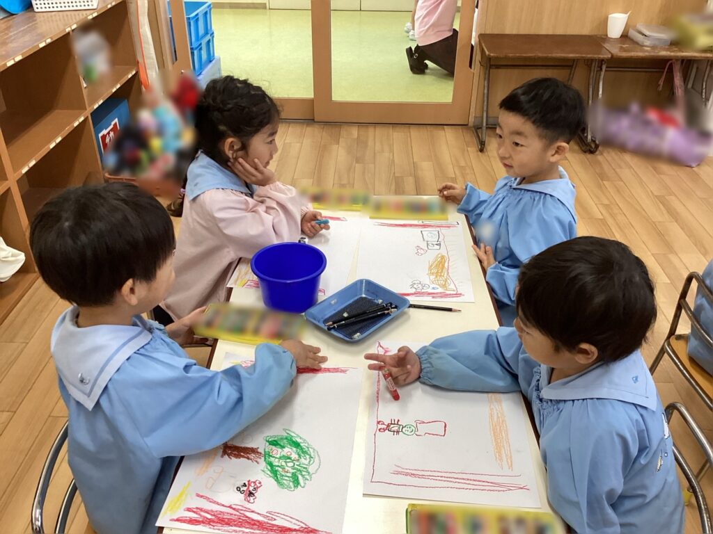 発表会の絵を描く活動では、「カニさんの帽子はほっぺがあったよね!」「柿の木の色はオレンジと黄緑だ!」とお友達と発表会の事を振り返りながら楽しい雰囲気で行う事が出来ました!