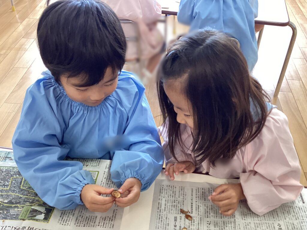 普段から園庭でどんぐりを集めている様子からも、楽しみにしている事が伝わってきました。