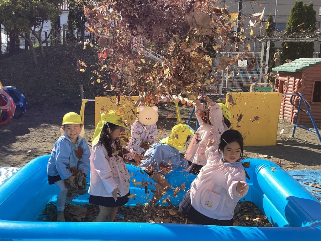 落ち葉プールではお友達と落ち葉を掛け合っていたり、