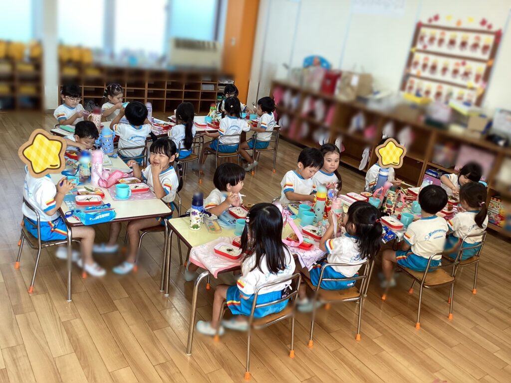 お友達同士誘い、会話を楽しみながら食べていました。最近では、「お兄さん、お姉さんだから食べられるんだー」と苦手な物にも挑戦する姿も見られ感心しています。