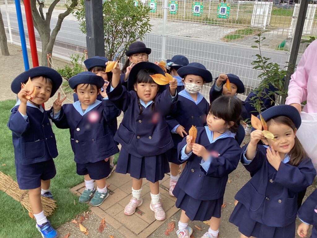 どんぐり山には綺麗な紅葉が広がっています。外遊びでは「赤い葉っぱきれいだね!」「黄色の葉っぱもある!」と様々な葉っぱを探すのに夢中なお友達。