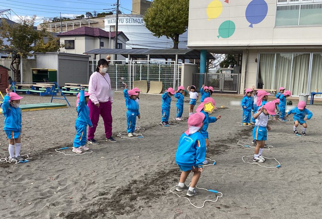 使い方や約束を確認し、その後は縄を使って丸や三角などに見立てて遊びました。また、「半分の半分」など先生の手本を良く見ながら縄を半分に折ることも出来ました。