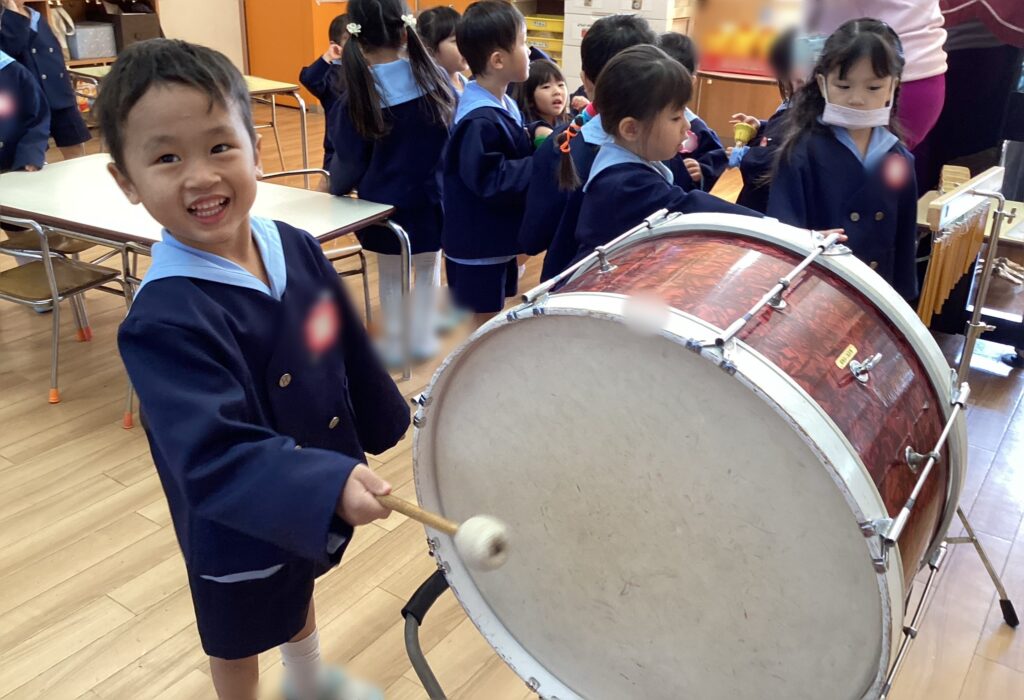 今回は、大太鼓や小太鼓、ツリーチャイムなどの楽器を鳴らしました。