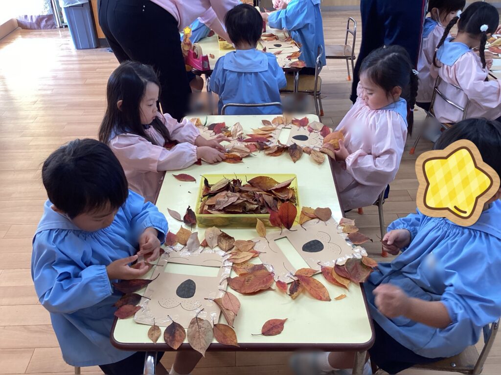 様々な種類の形や色の葉っぱを交互にして貼っていたり、隙間なく慎重に貼るなどして素敵なお面が完成。「ガォー」と手もつけてお友達と見せ合う姿が微笑ましかったです。