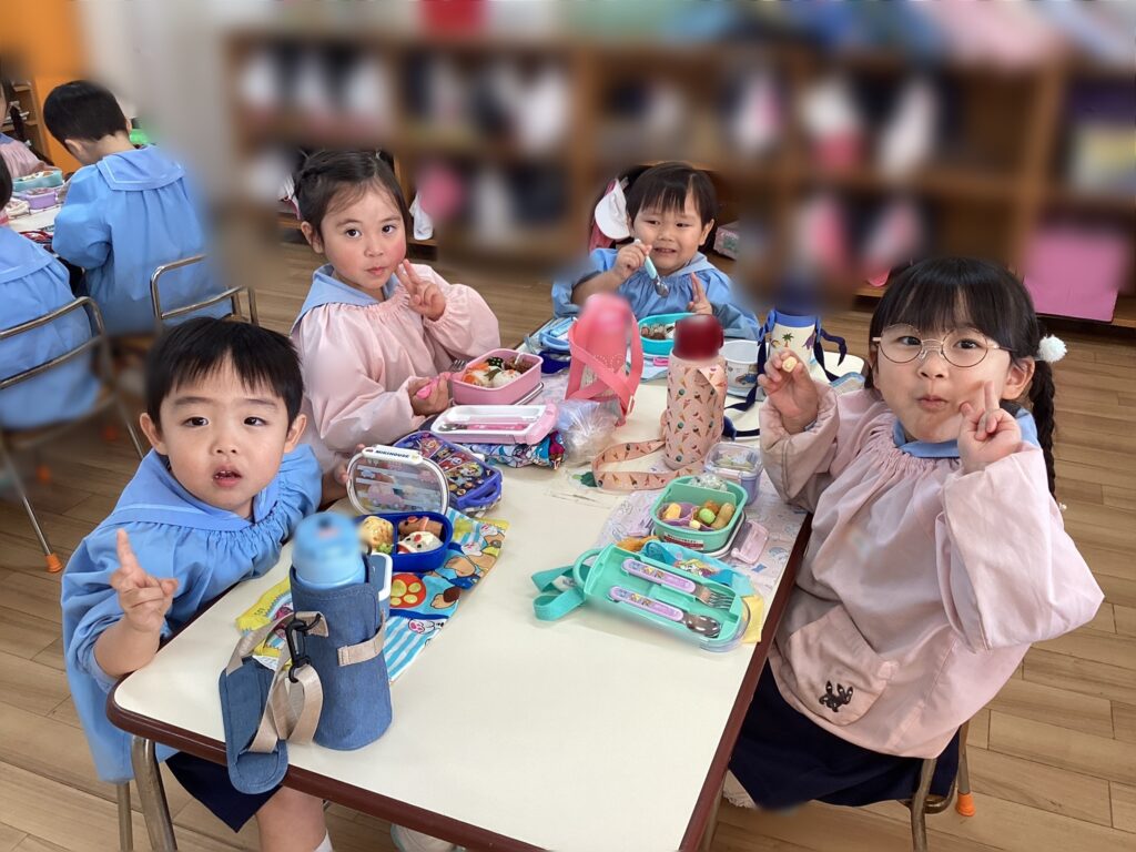 「今日はたまご焼き入っているんだ」「早く食べたいな」とお弁当の時間もとても楽しみにしていたお友達。近くのお友達と見せ合いっこしながら「美味しい」とモリモリ食べていました。