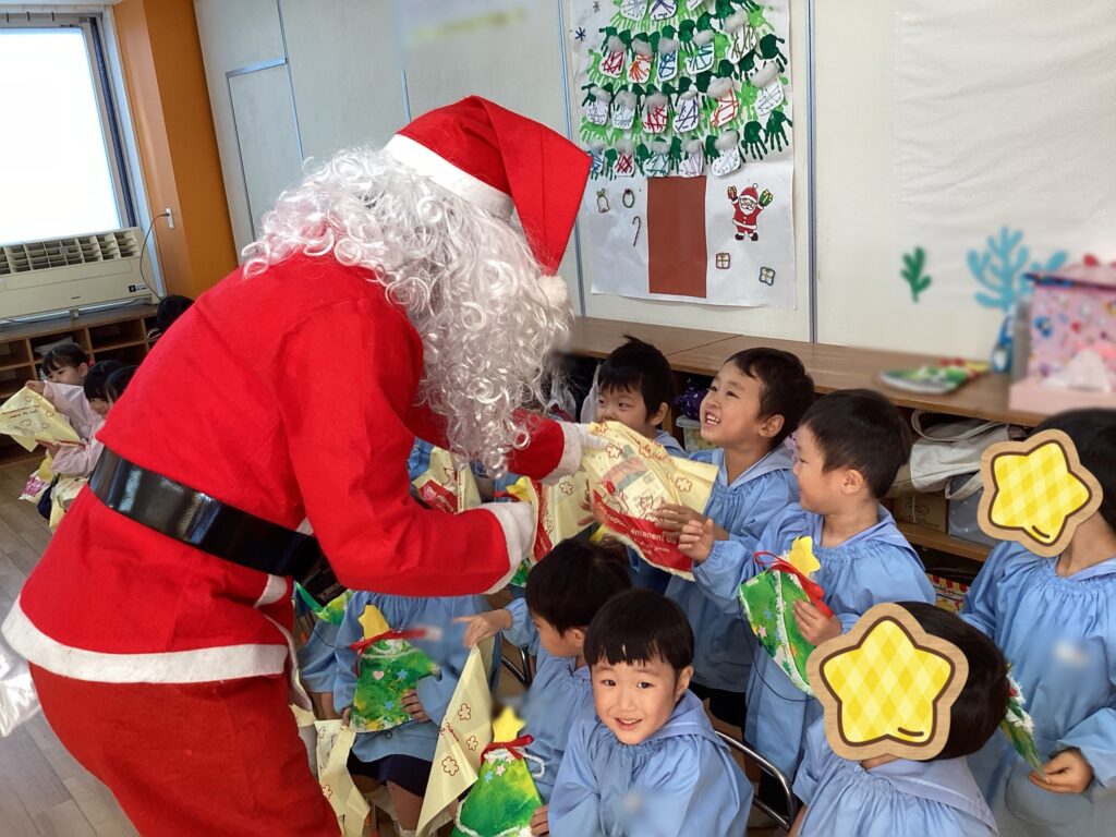 歌の発表を行い、先生達からの劇の発表を見た後はお部屋に戻り、サンタさんと写真撮影!そしてプレゼントを貰いました。