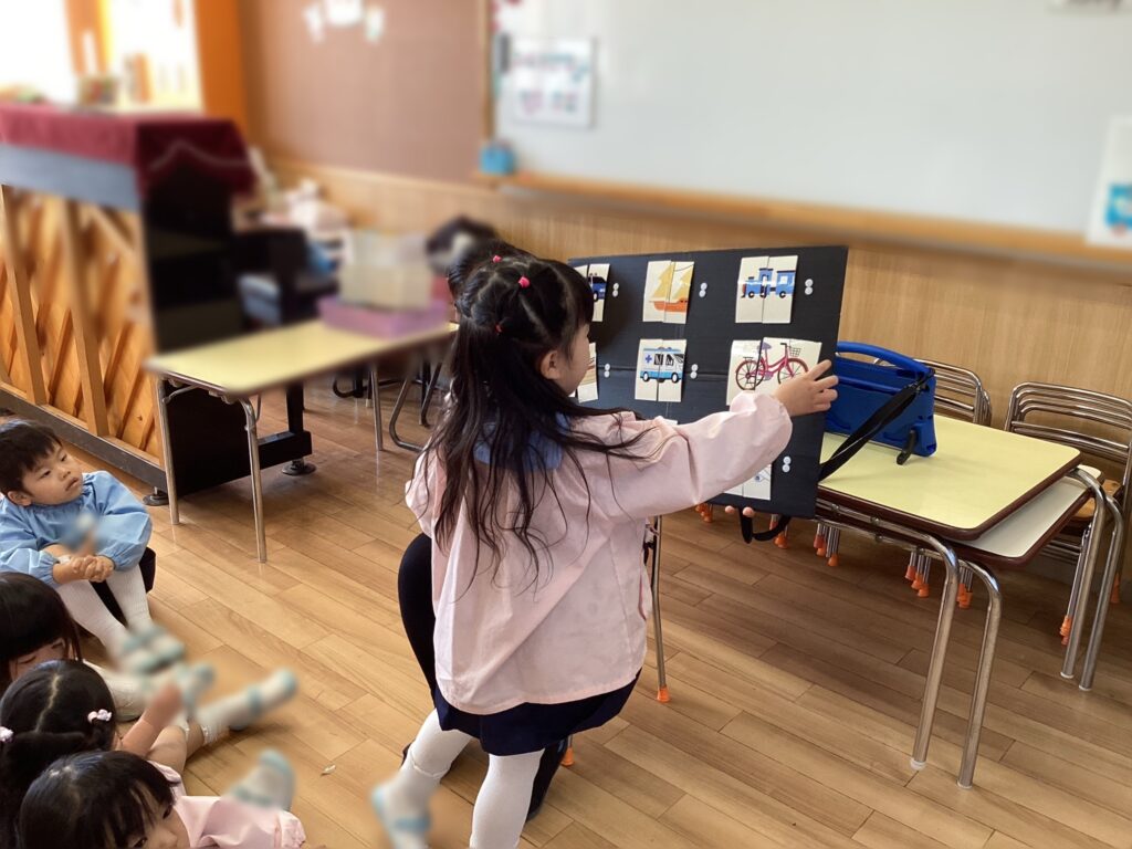 形が繋がるように考えながら貼り、乗り物の発音をしていきました。
