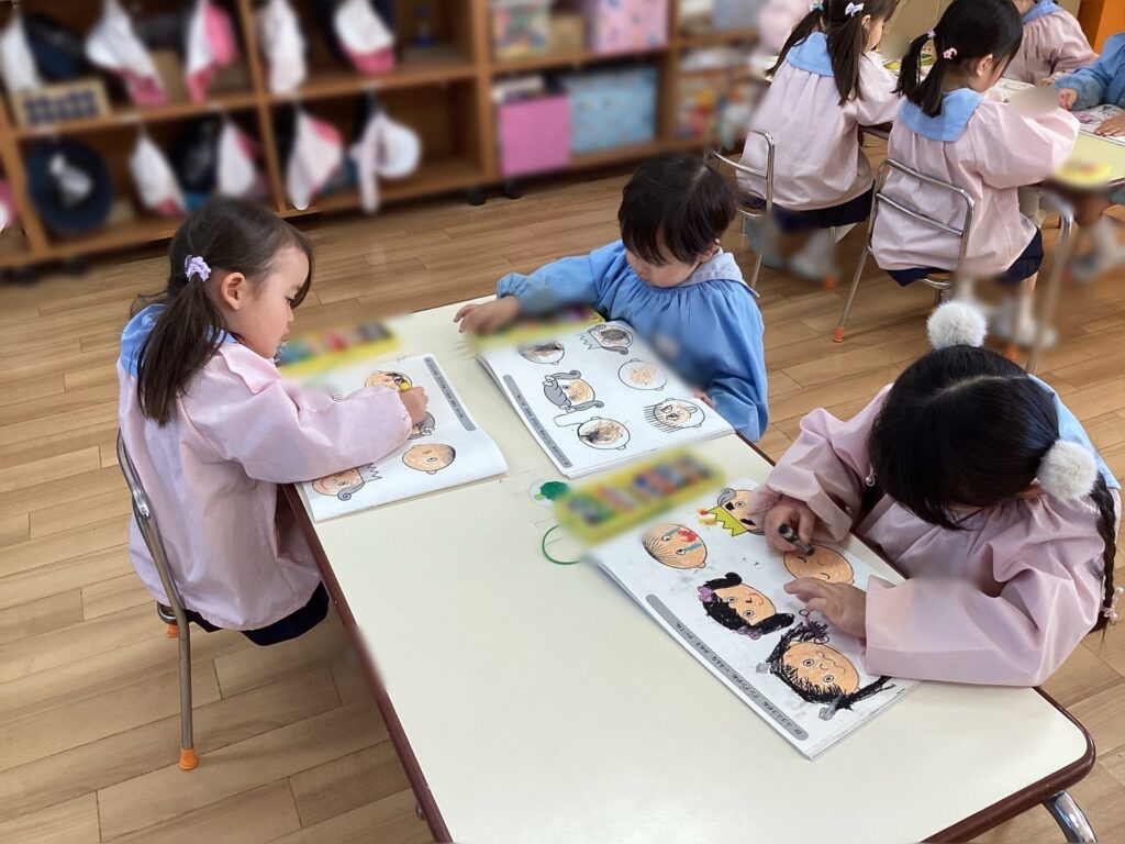 髪ゴム、髪の長さなど自分の髪型を描いたり、理想の髪型を描くなどそれぞれ違った顔が完成し、お友達同士見せ合いながら楽しく取り組んでいました。