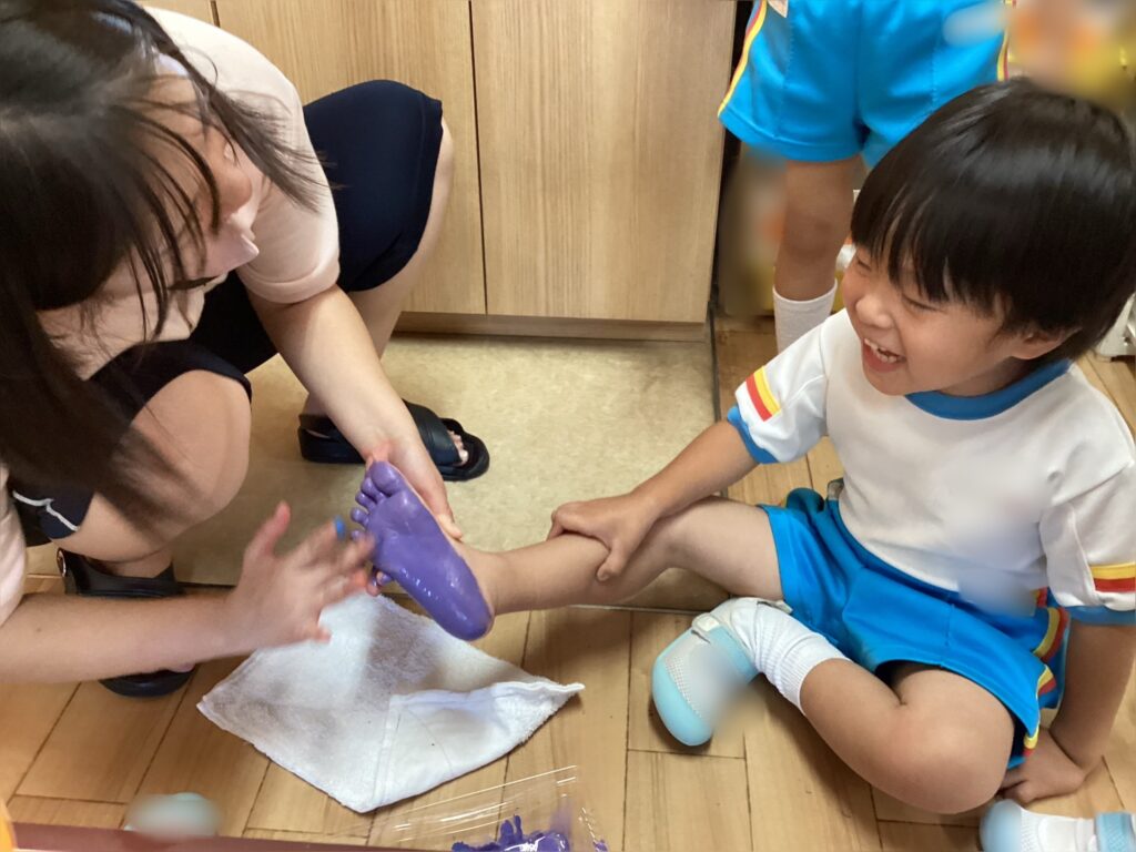 特に足型のぶどうに興味津々で、「くすぐったいよー」と言いながらも楽しく行っていました。年度末にお持ち帰りしますので、是非、手や足の大きさを比べてみて下さい。