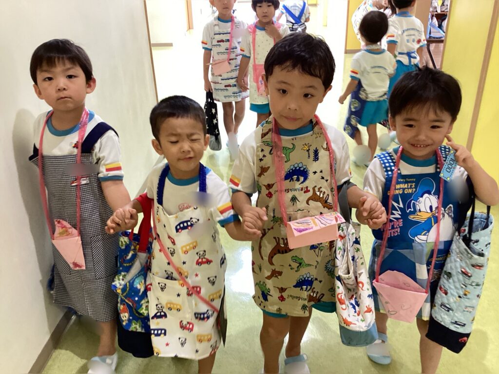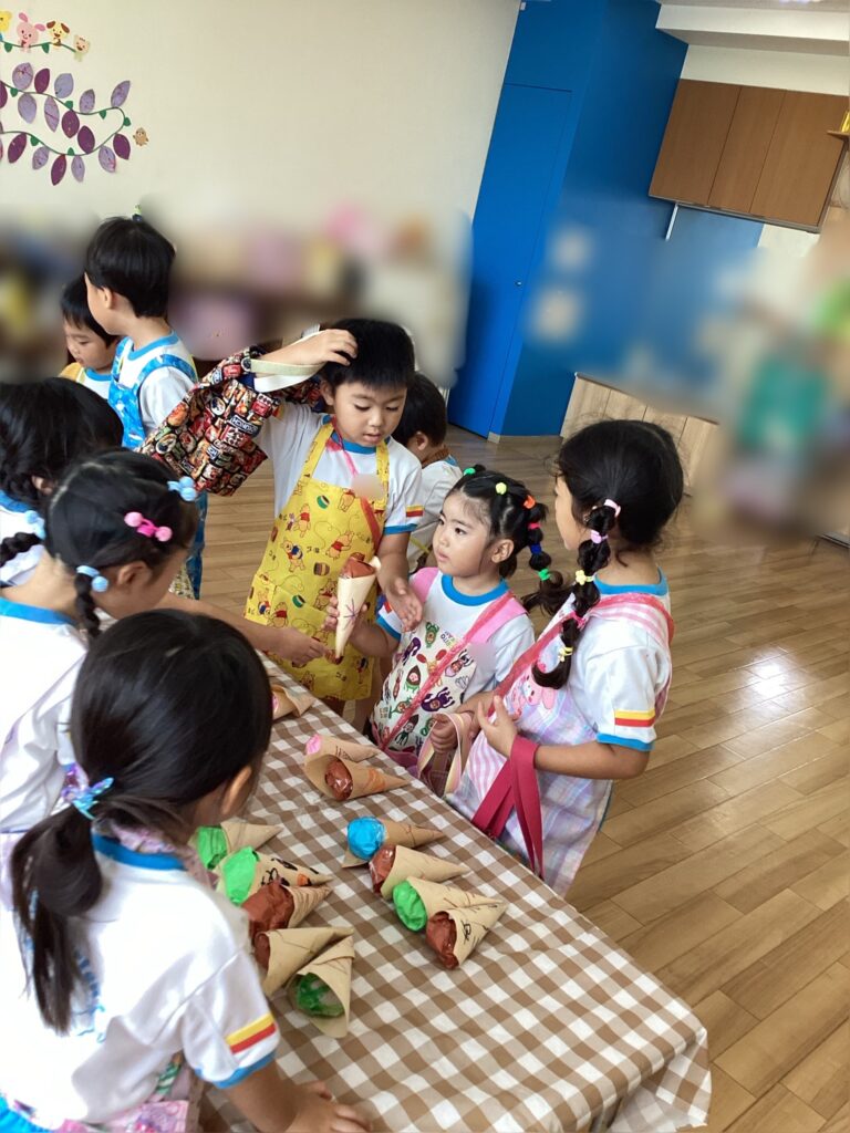 事前に何を買うのか尋ねてみた所、熱い日にぴったりな「アイス」や甘い「チョコバナナ」等様々。まだ決まっていなかったお友達も、売り買いの仕組みを教えてもらいながら伸び伸びと参加する事ができました。