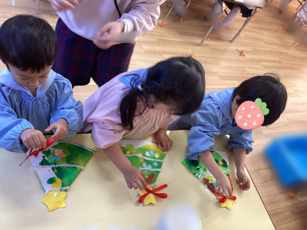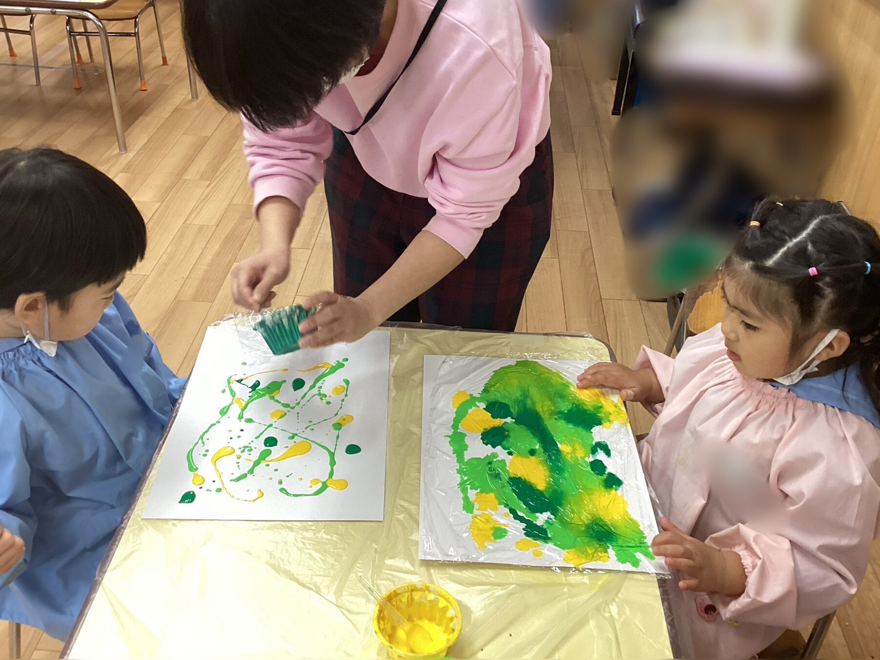 お楽しみ会に向けて、クリスマスツリーに見立てた帽子を製作していました。画用紙に水と混ぜた絵の具を垂らし、ラップの上から伸ばします。色が混ざっていく様子を見て「何色になるのかな?」とワクワクしながら行っていました。クリスマスツリーにオーナメントが付いたような素敵な帽子が完成したのでお持ち帰りする日を楽しみにしていて下さい。