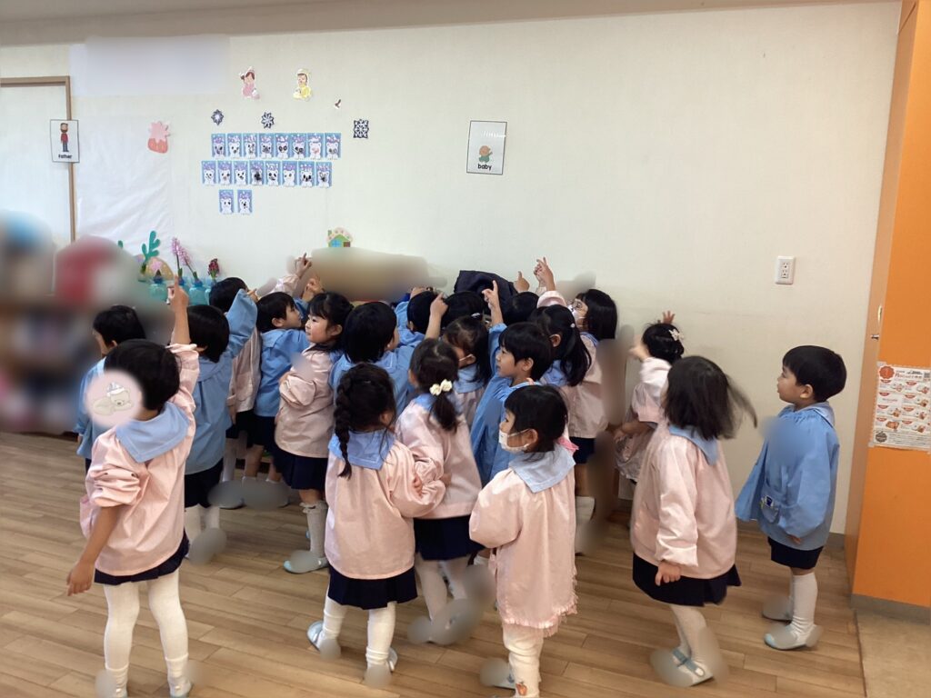指人形の5人の家族(mammy,daddy,brother,sister,baby)のうち、誰が消えるでしょうゲームをしている様子です。正解は…!?とワクワク、ドキドキで待っている姿が見られました♡
