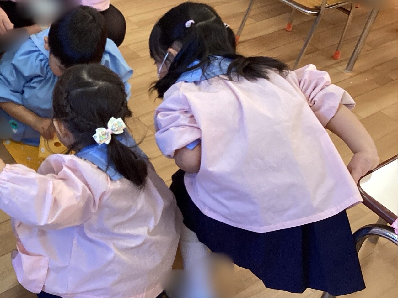 粘土で遊んでいた日に、粘土板や粘土を落としてしまったお友達がいました。このことに気付いたお友達が、「大丈夫?」と声を掛けながら一緒に拾ってくれたのですが、優しいお友達に囲まれている様子に感動しました^ ^