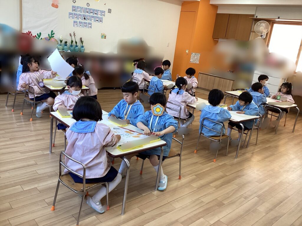 先週行った豆まきの事をよく思い出しながら描いていました。自分の顔や友達の顔、私の顔まで描いてくれたお友達がいて嬉しかったです。