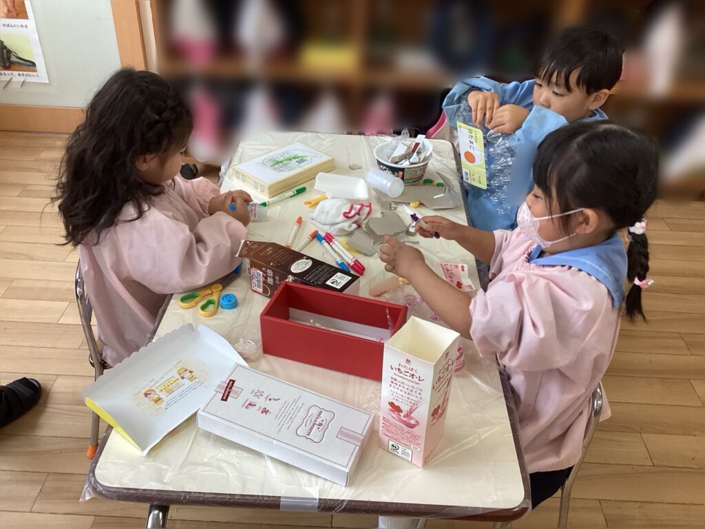 あえて見本を見せずに、製作を始めました。すると、子ども達の想像力が広がりバスや、お財布、温泉…など素材を活かした物が完成しました✨