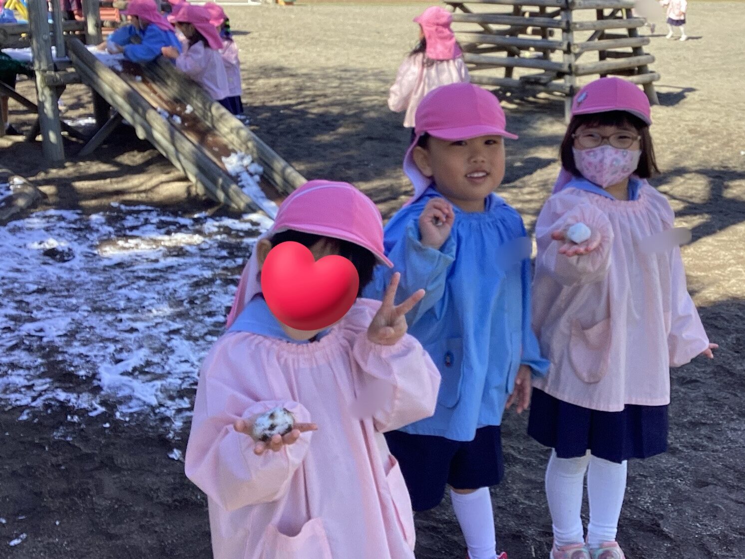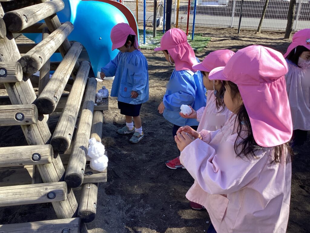 雪が沢山積もっていたため、園庭へ遊びに行き、雪だるまを作ったり少し投げてみたり…とキラキラの笑顔が沢山見られました。