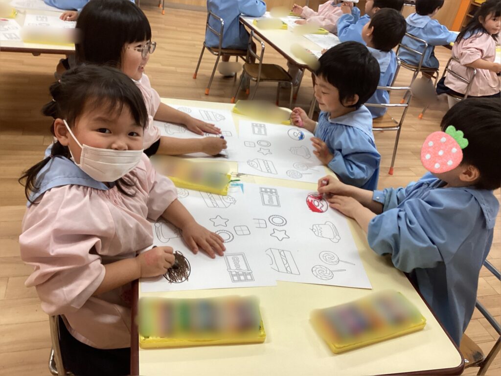 3月の誕生会で行うお店屋さんごっこに向けて品物の色を塗りました。1組のお部屋では〈プリン〉〈チョコ〉〈ドーナツ〉など美味しそうなお菓子屋さんを開店します。