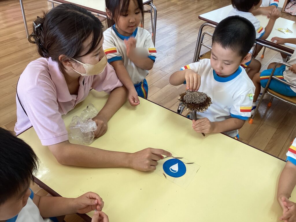 1学期に植えたひまわりの種から、芽が出て花が咲き、再び種が出来ました。1人ずつ観察しながら種の収穫に挑戦です。